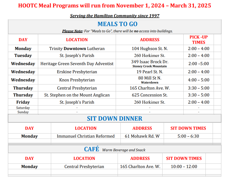 Hamilton Out of the Cold will be serving MEALS TO GO at Central on Thursdays from 3:30 – 5:00 p.m.