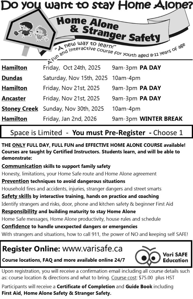 Vari Safe ~ Babysitting Training and Home Alone & Stranger Safety Classes ~ November 21, 2025 9:00 a.m. – 3:00 p.m.