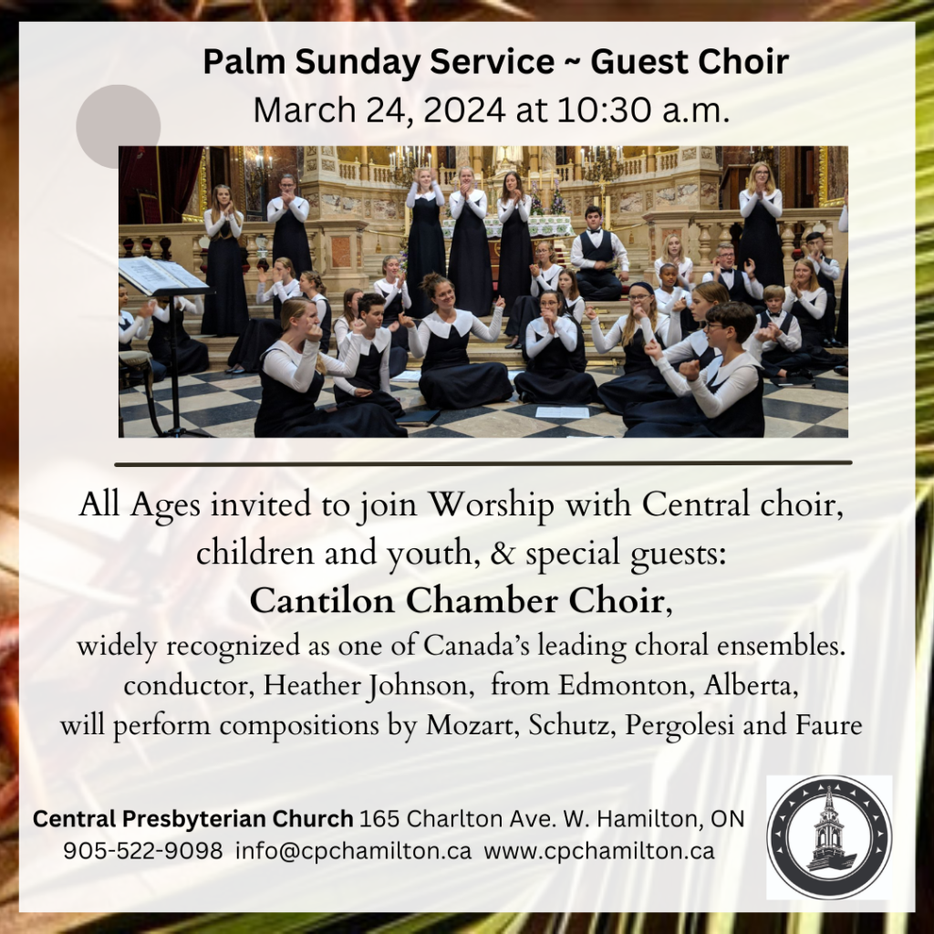 All Ages Worship with Central choir, children and youth, & special guests The Cantilon Chamber Choir, widely recognized as one of Canada’s leading choral ensembles. Founded in 1999 by conductor, Heather Johnson, the choir of 33 singers ages 12-20 will perform compositions by Mozart, Schutz, Pergolesi and Faure – as we move liturgically from Palm Sunday into Passion Week.
