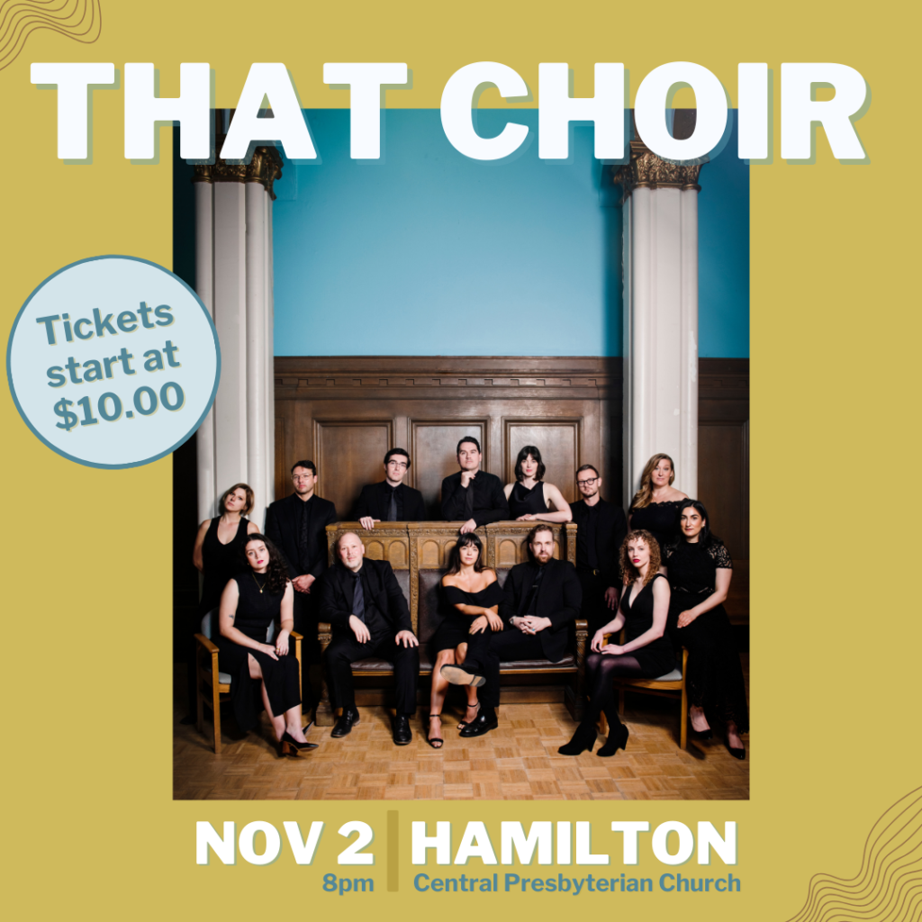 Come join us on November 2nd at 8pm for a magical evening of contemporary choral music at Central Presbyterian Church in Hamilton! That Choir’s award-winning, sixteen-member ensemble will captivate you with its rich and diverse repertoire, featuring ethereal harmonies and stunning pieces by composers like Eric Whitacre and Anton Bruckner. Let yourself be inspired and uplifted by extraordinary a cappella performances. Tickets start at just $10—don’t miss out on this unforgettable experience!
